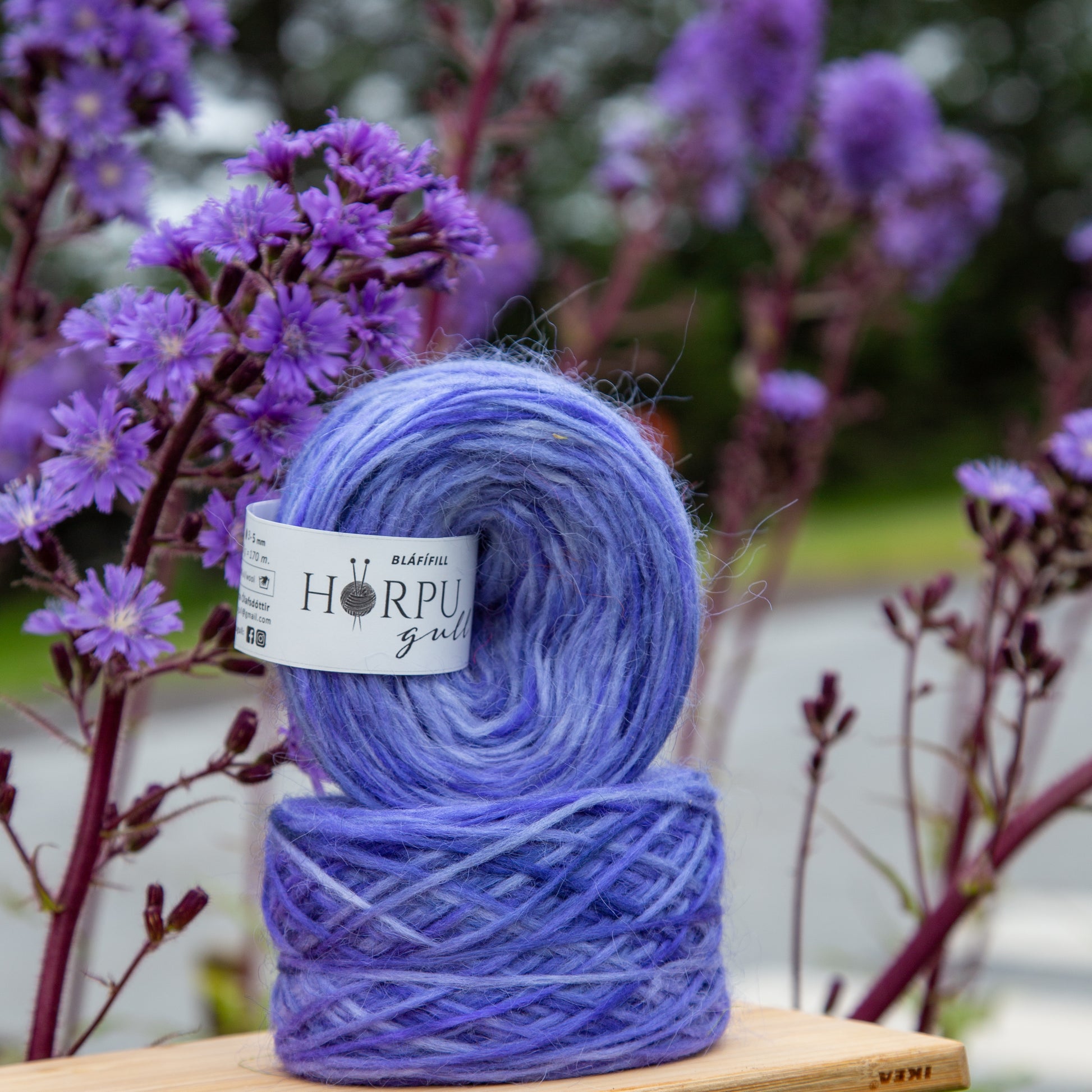 Hörpugull is 1-ply unspun white wool from first class Icelandic lambwool that is hand-dyed with acid-dyes. Hand-dye makes each skein unique and brings a variety of vivid and bright colours, so the colour can vary from the colour shown here on photo.