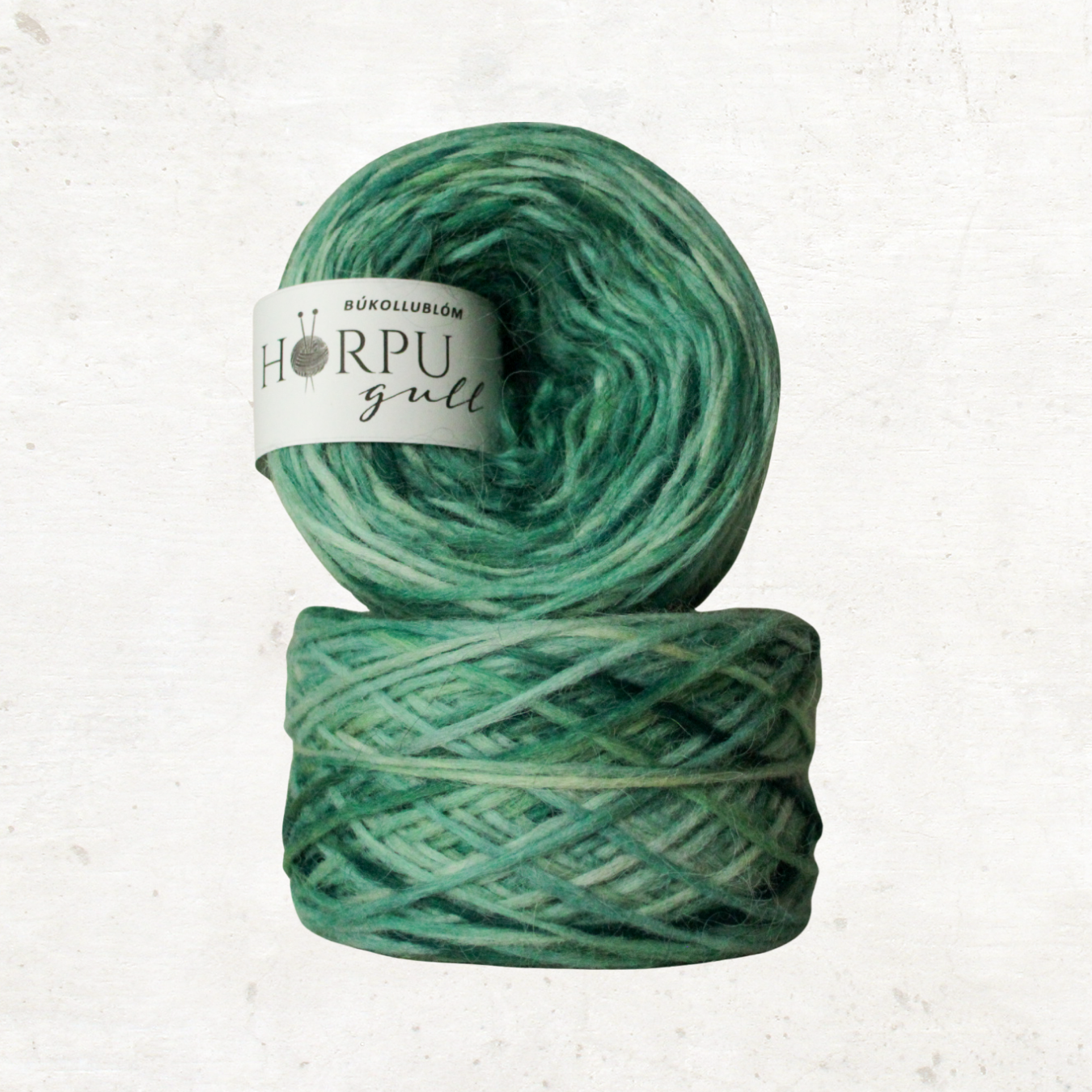 Hörpugull is 1-ply unspun white wool from first class Icelandic lambwool that is hand-dyed with acid-dyes. Hand-dye makes each skein unique and brings a variety of vivid and bright colours, so the colour can vary from the colour shown here on photo.