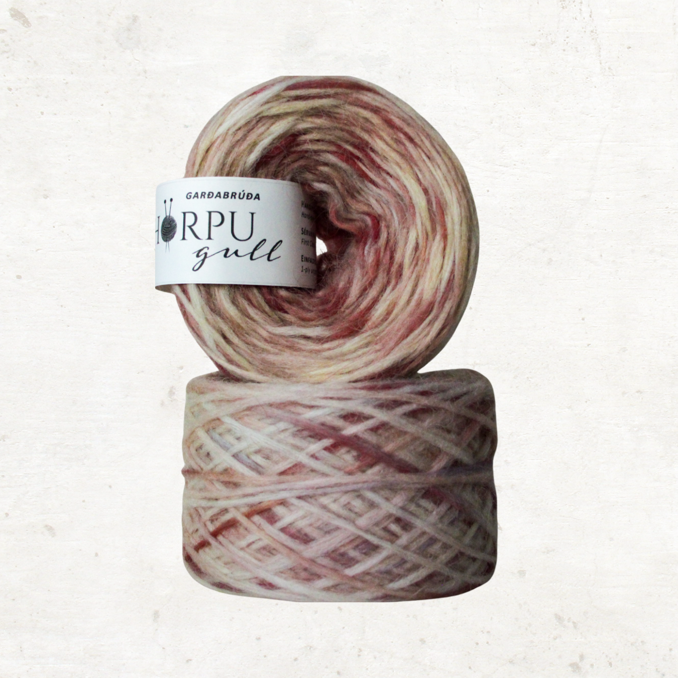 Hörpugull is 1-ply unspun white wool from first class Icelandic lambwool that is hand-dyed with acid-dyes. Hand-dye makes each skein unique and brings a variety of vivid and bright colours, so the colour can vary from the colour shown here on photo.
