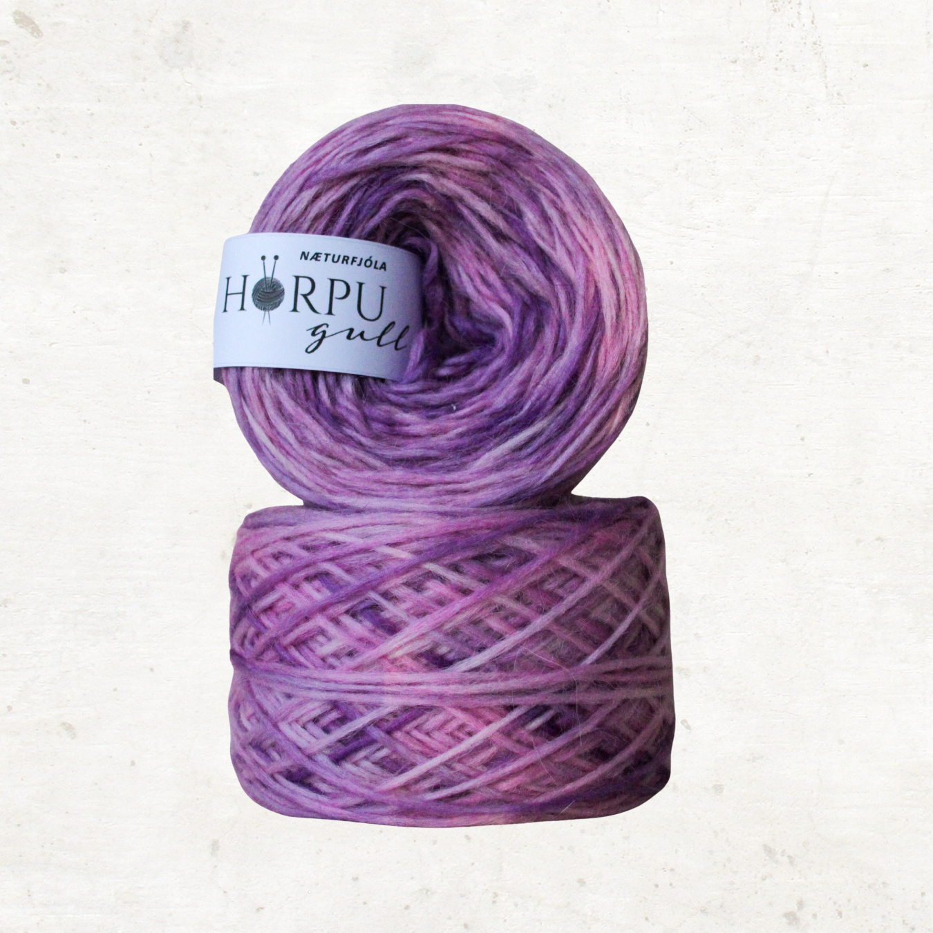 Hörpugull is 1-ply unspun white wool from first class Icelandic lambwool that is hand-dyed with acid-dyes. Hand-dye makes each skein unique and brings a variety of vivid and bright colours, so the colour can vary from the colour shown here on photo.